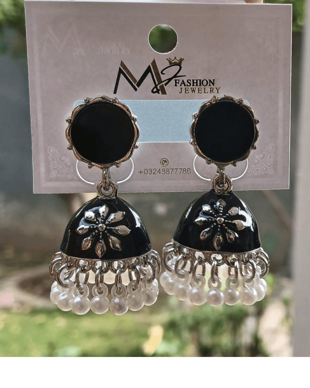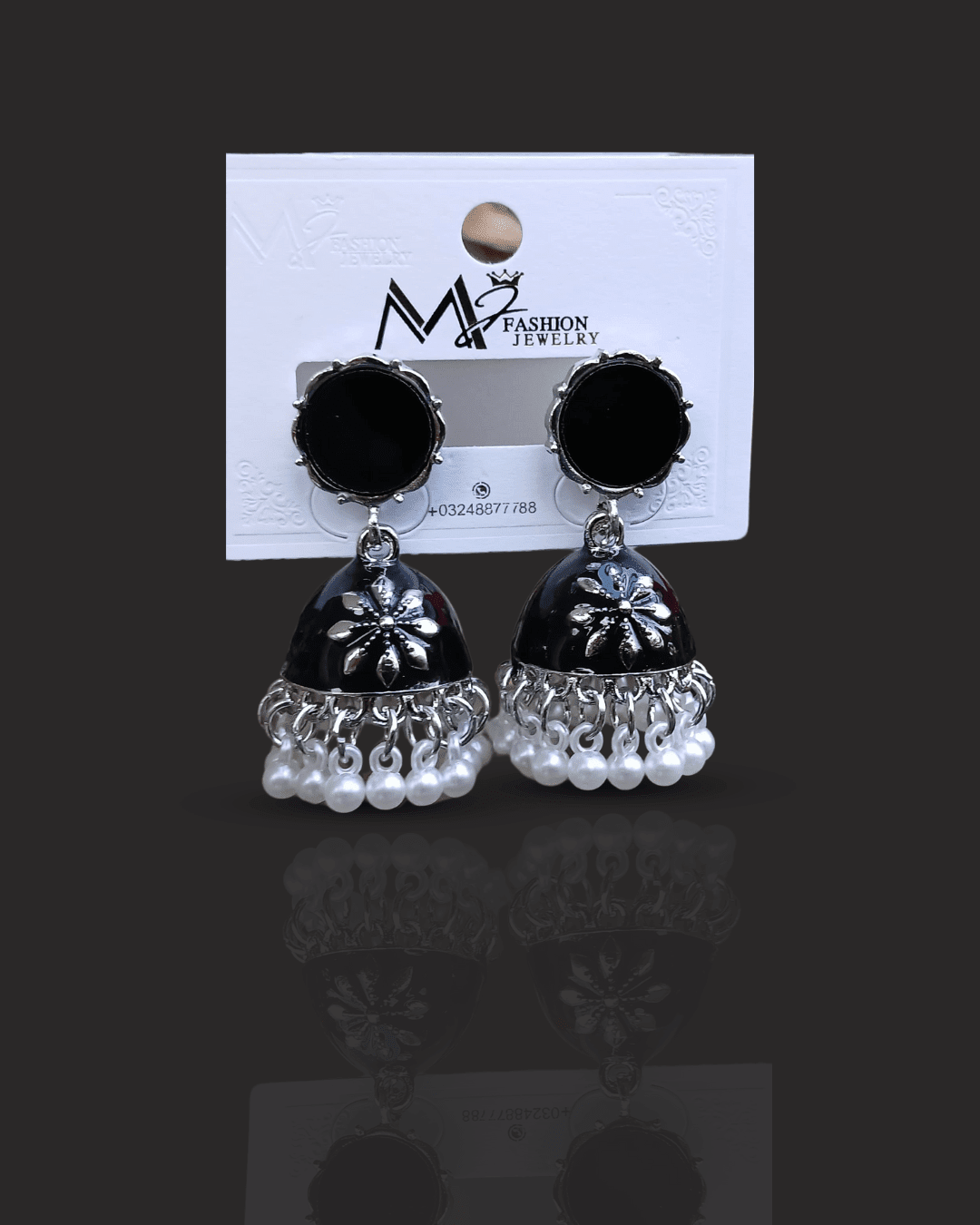 Chic black enamel jhumka earrings with silver floral detailing and pearl drops. Lightweight, elegant, and perfect for any event. Imported from China.